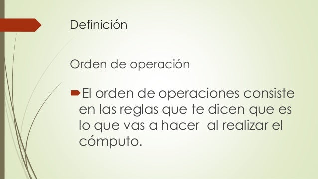 EL ORDEN DE OPERACIONES SE USA PARA RESOLVER LAS MISMAS EN UN ORDEN QUE SE LLAMA PEDMAS. PEDMAS ES PARENTESIS CORCHETE ETC EXPONENTES DIVICION Y MULTIPLICACION EN ORDEN DE DERECHA A IZQUIERDA Y LO MISMO QUE CON */ .